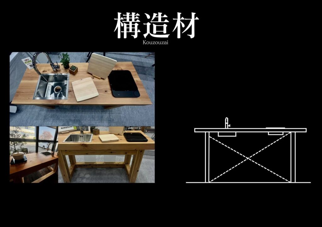 解体時に出た構造材を再利用し、きれいに面を取り製作したリサイクルキッチン