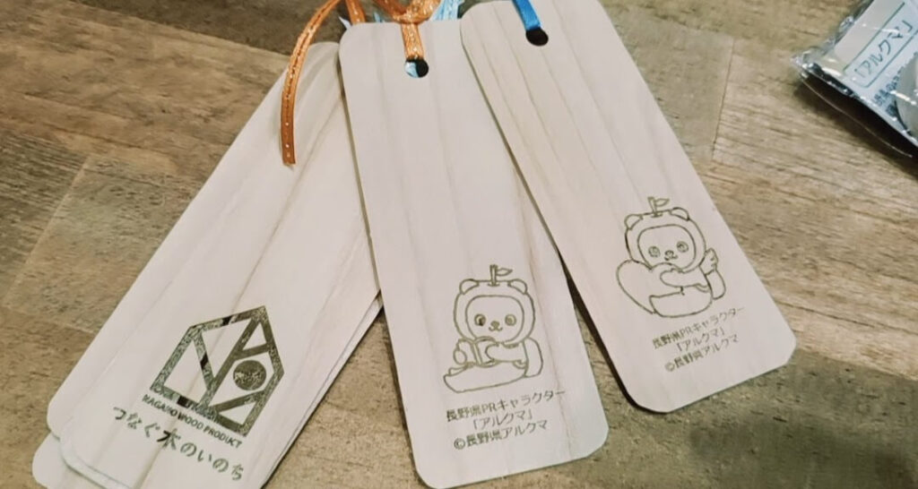 長野県ブースではご来場者の皆様にアルクマちゃんを型押しした経木のしおりといろんな種類の木材を使用したマグネットをプレゼント!
