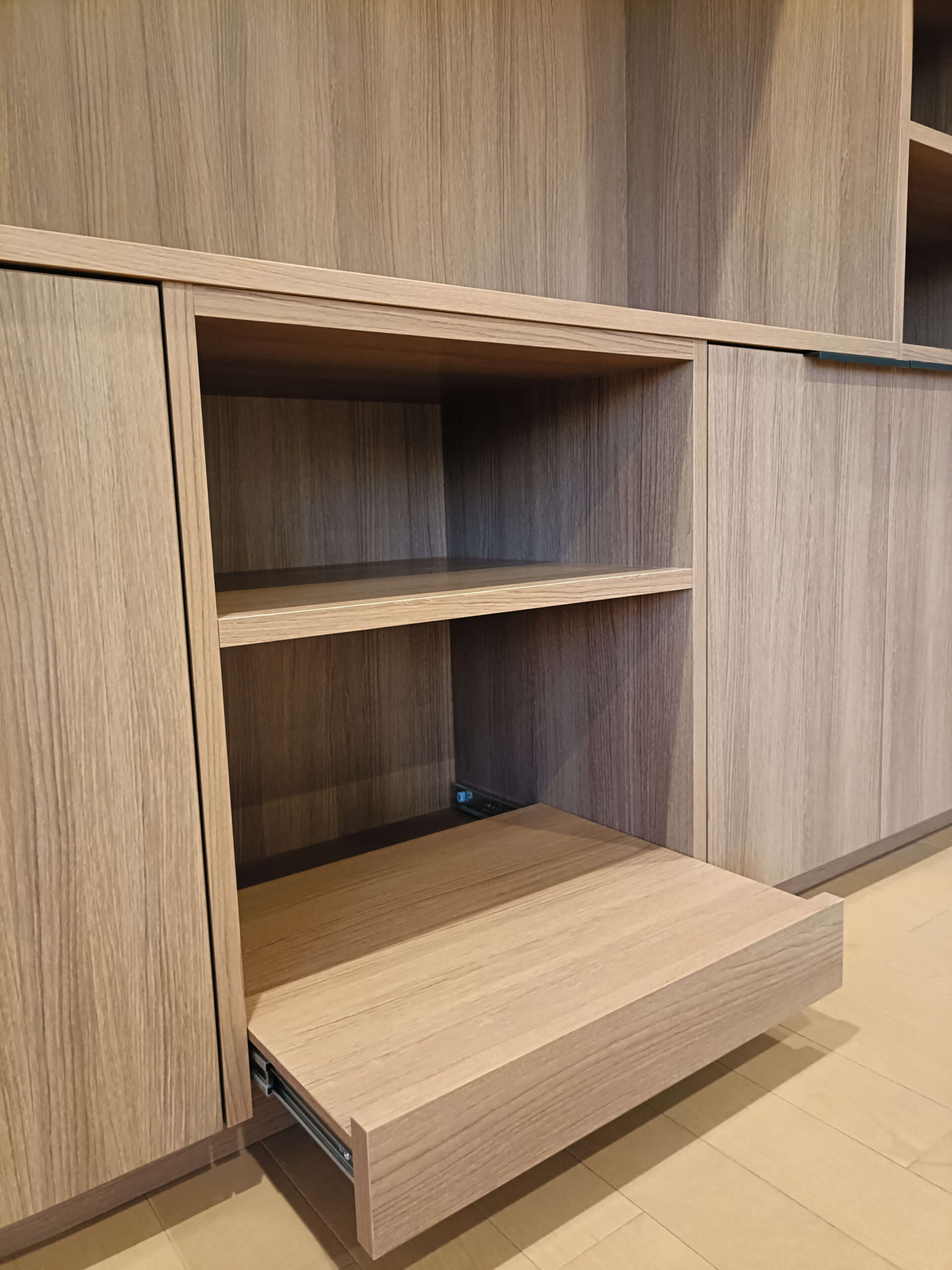 TV収納は壁一面に設置して存在感はありつつ、横壁と面合わせにしてすっきりとした印象に。